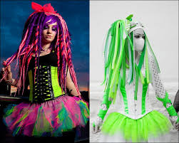 O estilo mistura roupas pretas com cores brilhantes. Néon verde, vermelho, azul, cromo ou rosa. Materiais como borracha e PVC podem ser misturadas e combinadas em um esforço para criar uma aparência mais artificial.
